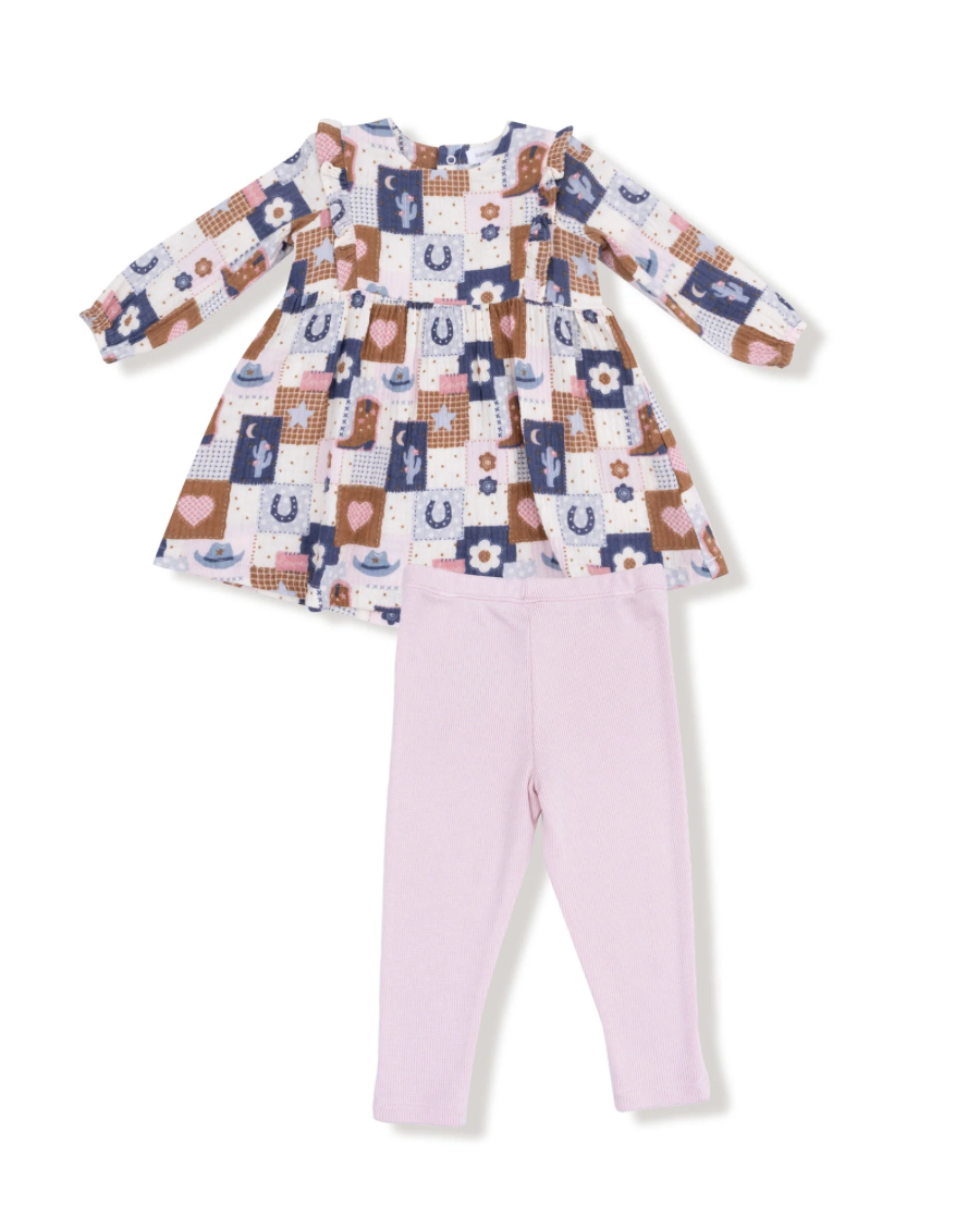 Angel Dear Patchwork Cowgirl Ruffle Long Sleeve Girls Dress & Ribbed Leggings