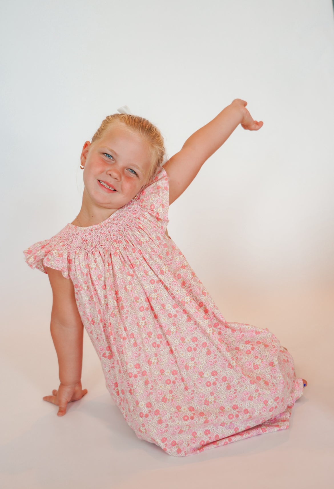 Add some flower power to your girl's wardrobe with the Brooklyn Pink Flower Print Smocked Dress. The delicate flutter sleeves and smocked design add a touch of sweetness, while the playful pink flower print brings the perfect pop of color. Perfect for free-spirited girls with a flair for style! Matching sister bubble available!