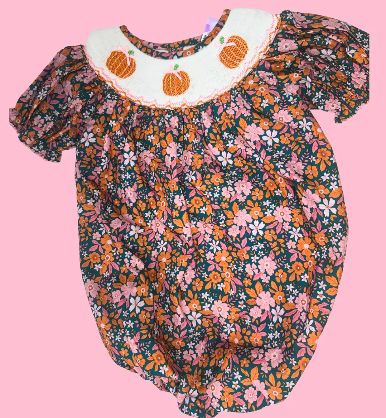 We've got your covered for all your little girl's fall outfit needs! This pink and orange smocked bubble is sure to be a favorite!