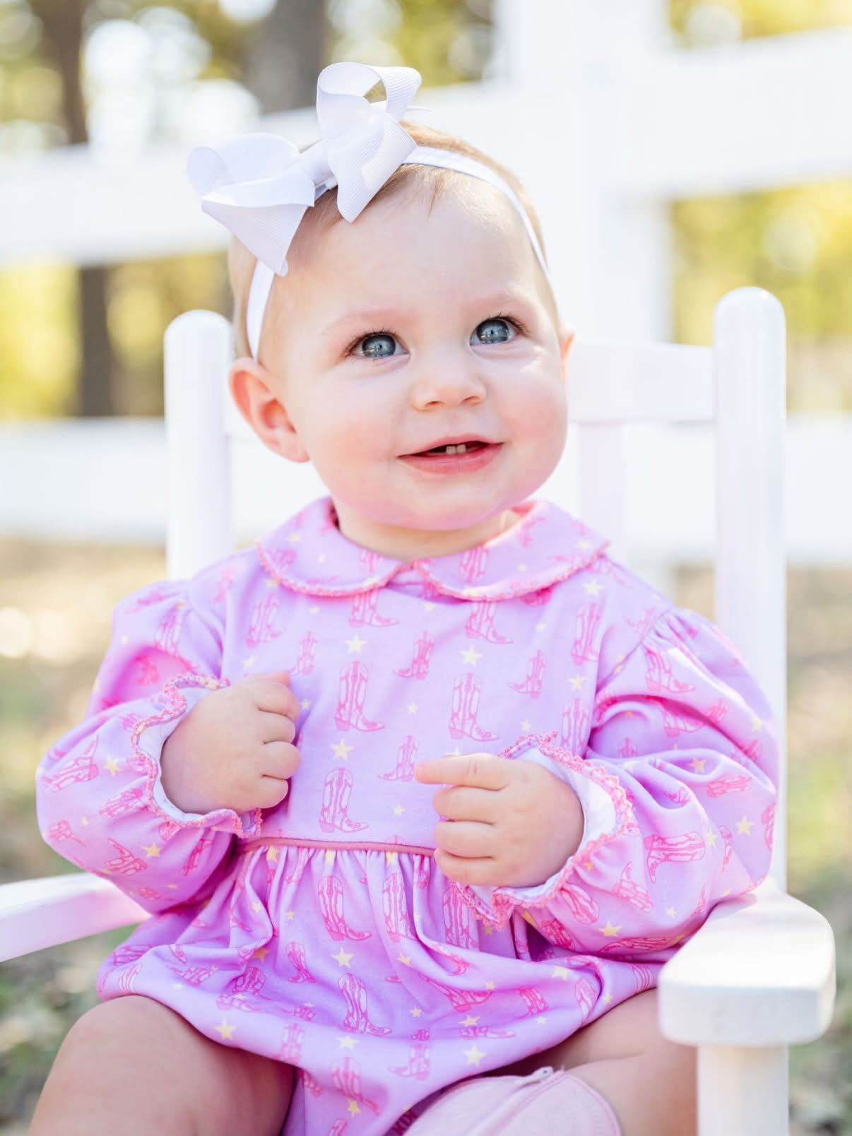 The Boots and Stars Pink Bubble for Girls is a soft, 100% pima cotton long sleeve dress with a fun cowgirl boots and star print. Perfect for rodeos, playdates, photos, and everyday adventures, it’s comfortable, cute, and made for little girls who love to move and play.