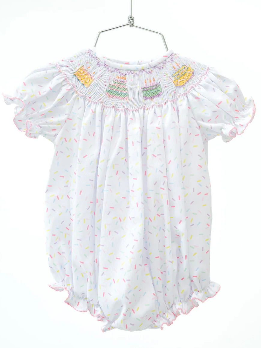 Celebrate your little one’s big day with our Smocked Sprinkle Birthday Cake Bubble, featuring an all-over colorful sprinkle pattern and smocked birthday cakes on the bodice. This timeless, heirloom-quality bubble combines playful charm with classic elegance, making it the perfect outfit for her special moments. Designed for comfort and style, it ensures your birthday girl looks absolutely delightful.