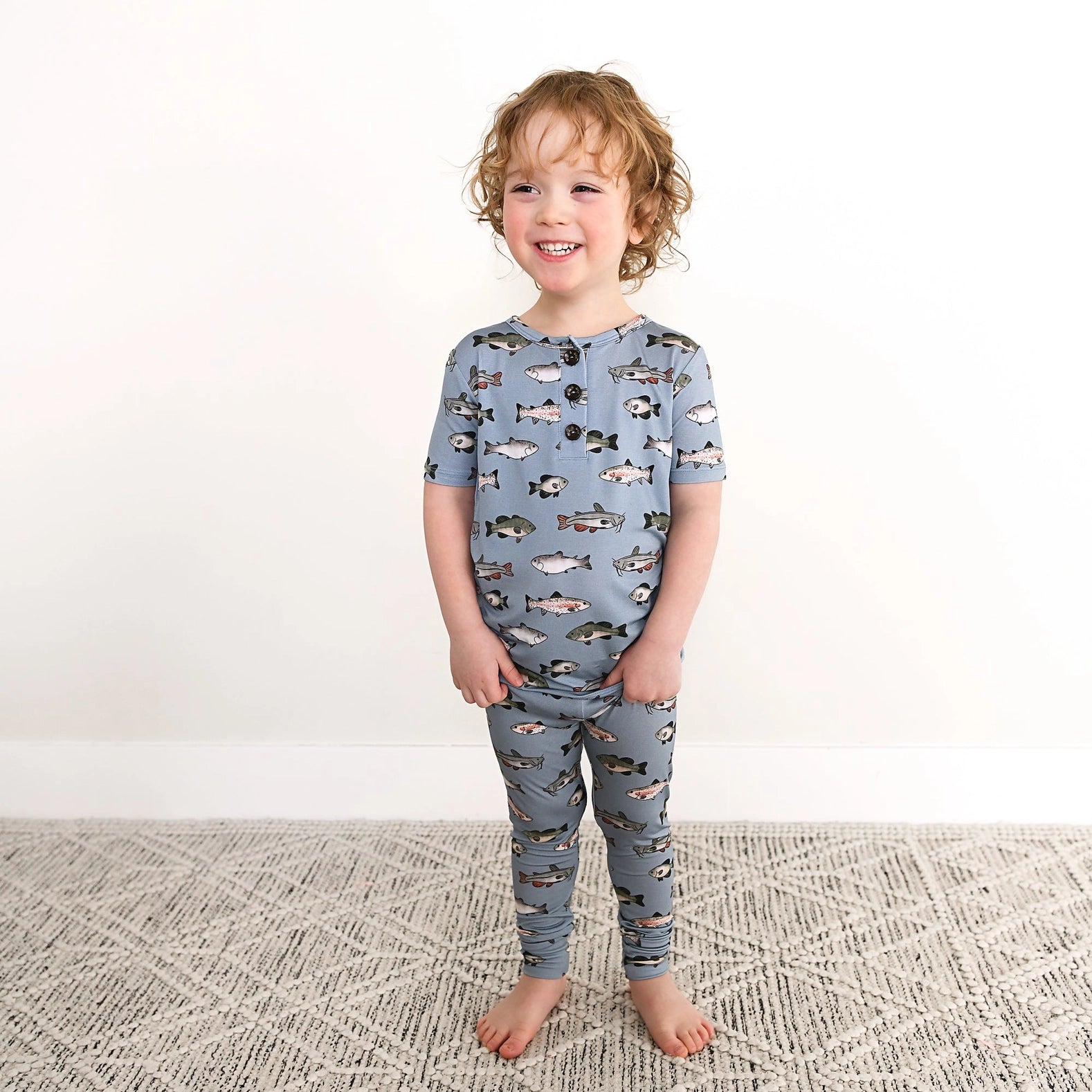 Two-piece bamboo viscose lounge set for toddlers featuring functional buttons and fish prints